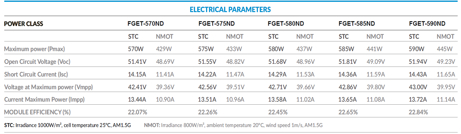 Durch die Verwendung der 210–182 mm großen SMBB-Technologie (Super Multi BusBar) monokristalliner Halbzellen des N-Typs für Hochleistungs-Solarzellen werden durch die höhere Komponentenleistung die System-BOS-Kosten effektiv gesenkt Artikelnummer: FG580-G12R Kapazität: 565–585 W Zellenanzahl: 108 Stück Mindestbestellmenge: 36 Stück Moduleffizienz (%): 22,52 % Abmessungen: 2279*1134*34MM Gewicht: 31,5 kg Verpackungsnummer: 36 Stück/Palette 40'HQ-Container: 20 Paletten / 720 Stück